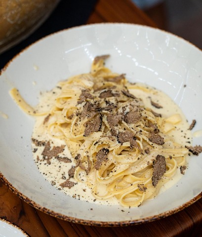 Disiapkan segar di depan Anda, pasta panas dicampur dalam roda Grana Padano yang sudah tua, menyerap esensi krim dan gurih dari keju saat meleleh. Penyajian memasak langsung ini menambah sentuhan teater pada hidangan.