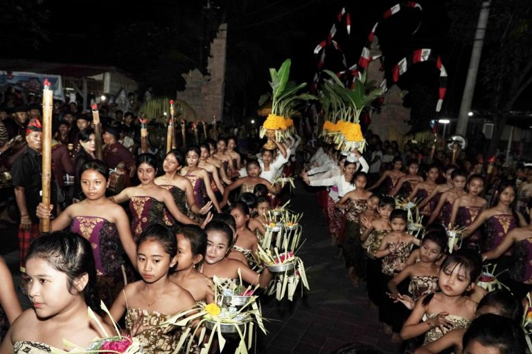 Approximately 250 children participated in the performance, with 150 girls as dancers and carriers of the uparengga (a type of torch-like offerings), and 100 boys as gamelan players.