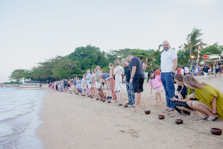 DENPASAR, balitourismnow.com – Sore itu wisatawan berkumpul di Pantai Sanur, tepatnya di depan Restoran Griya Santrian Beach Resort penuh senyum gembiraa. Masing-masing dari mereka membawa “kobokan”, wadah kecil terbuat dari tempurung kelapa berisi air dan tukik, anak penyu.