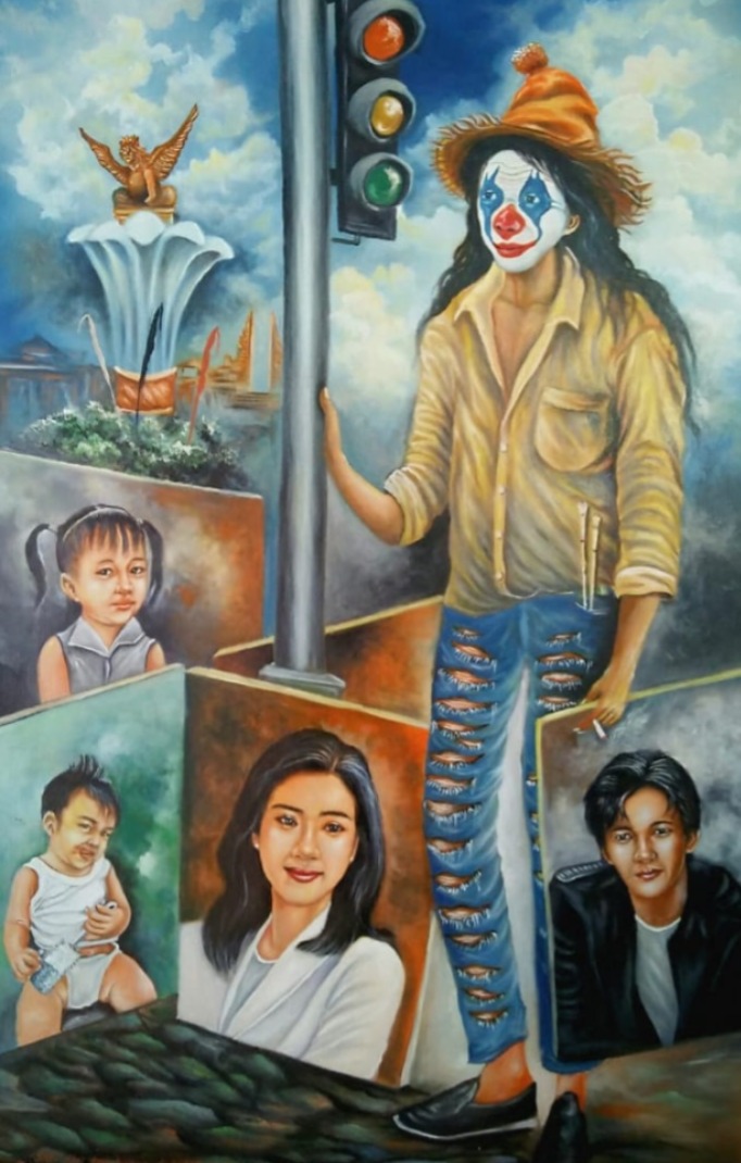 Md. G. Karma Wedha, dengan karya “Jati Diri Tidak Harus Dipublikasikan tapi Pembuktian”, menampilkan sosok anak muda berwajah badut dengan jeans robek dari atas ke bawah. Melalui satir visual, ia mengingatkan bahwa identitas seseorang tak bisa diukur semata-mata dari tampilan luar.