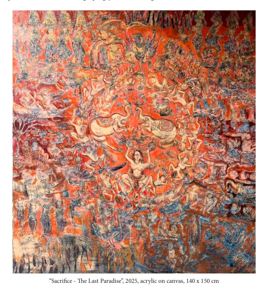 Tak kalah penting, Dr. I Nengah Wirakesuma menampilkan karya berjudul “Earth Mandala”. Dalam lukisan ini, ia meramu simbol kosmologi Bali dengan lanskap agraris Tabanan. Pola mandala tanah dipenuhi warna-warna bumi, padi, dan air, menyiratkan keseimbangan unsur semesta yang menopang kehidupan.