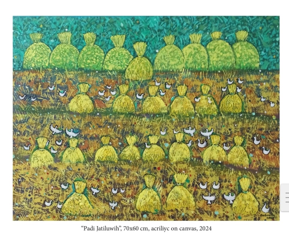 Lukisan “Padi Jatiluwih” karya I Made Subrata menghidupkan hamparan sawah berundak yang bergoyang diterpa cahaya. Pada beberapa bagian, tampak burung kuntul beterbangan bebas, menandakan ekosistem yang hidup dan harmoni—sebuah pengingat bahwa hasil agraria bukan hanya dinikmati manusia, tetapi juga menopang keberlangsungan seluruh makhluk dalam lingkungannya.