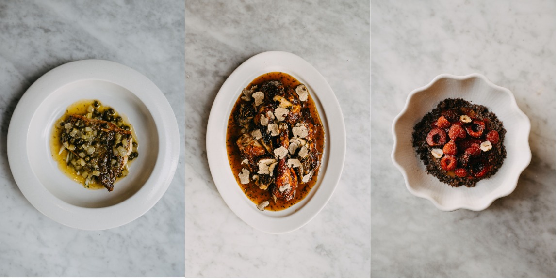Guests can then choose from Market Fish served à la Meunière with delicate herbs; Shrimp Risotto with grilled wild shrimp, Creole spices, and nduja butter (nduja is a soft, spreadable Calabrian pork salumi, renowned for its deep, spicy and smoky flavor), or the elegant Poulet Ballotine.