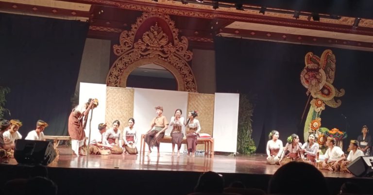 Pementasan tampil apik lewat perpaduan gamelan selonding dengan sentuhan musik modern seperti gitar bass, keyboard, dan musik digital.